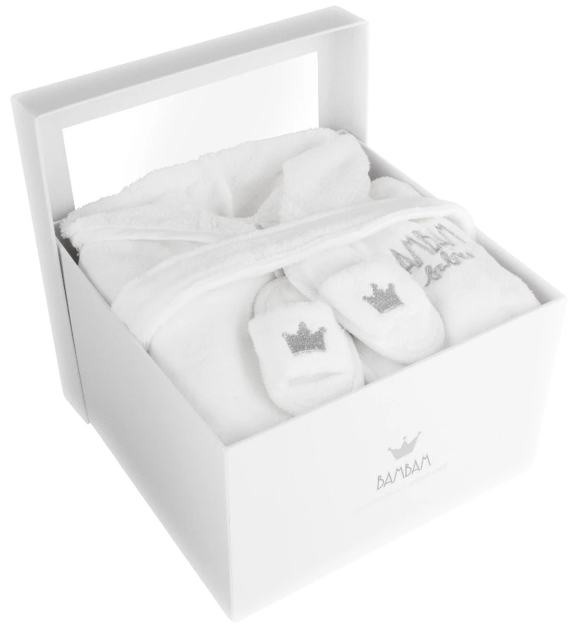 Deze bad geschenkset van BamBam is een leuk setje om cadeau te geven aan (toekomstige) ouders. De set bevat een badjasje in maat 50/56 en bijpassende badslippers. Het badjasje en de slippers zijn gemaakt van zacht badstof en is dus heel comfortabel voor een pasgeboren kindje.Â