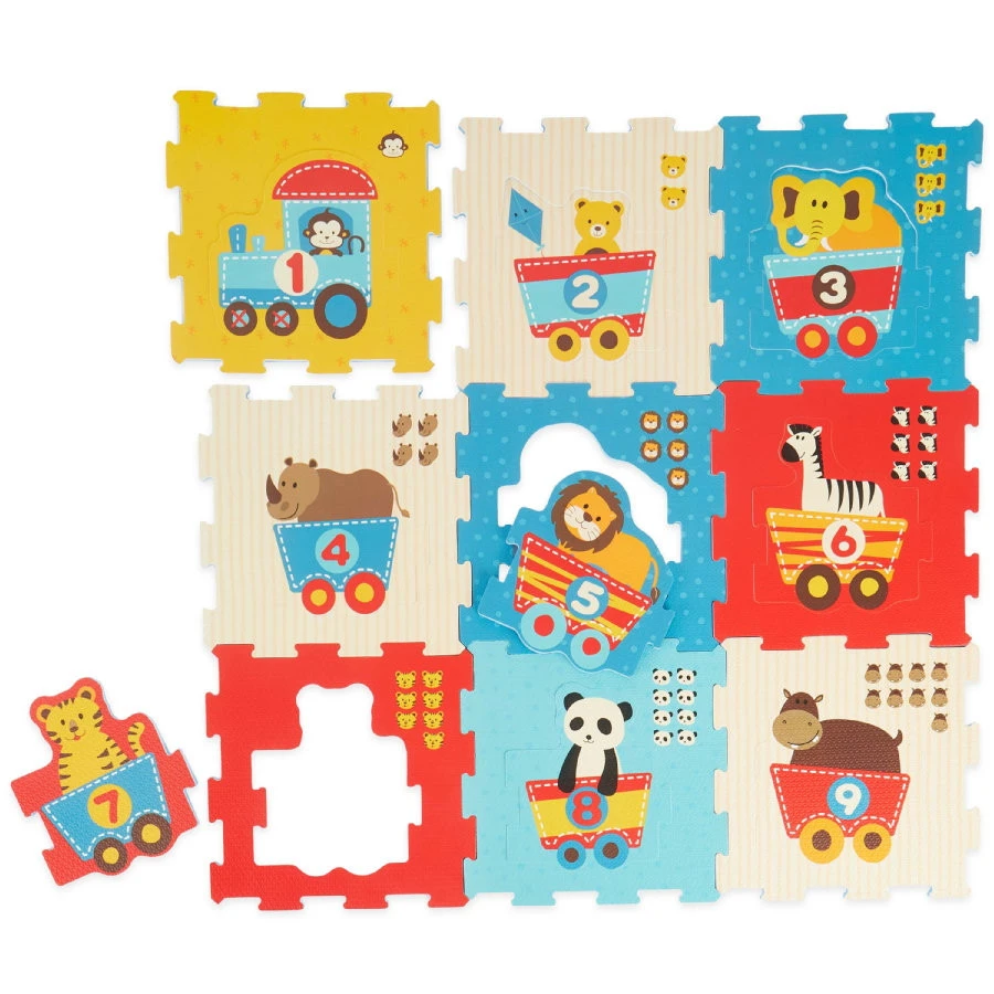 Met deze vrolijk gekleurde dieren trein schuimrubberen puzzelmat wordt je kleintje tijdens het spelen de cijfers 0 tot en met 9 aangeleerd. Met de puzzelstukken kan een mat worden gevormd en er kan een leuke kubus van gemaakt worden.