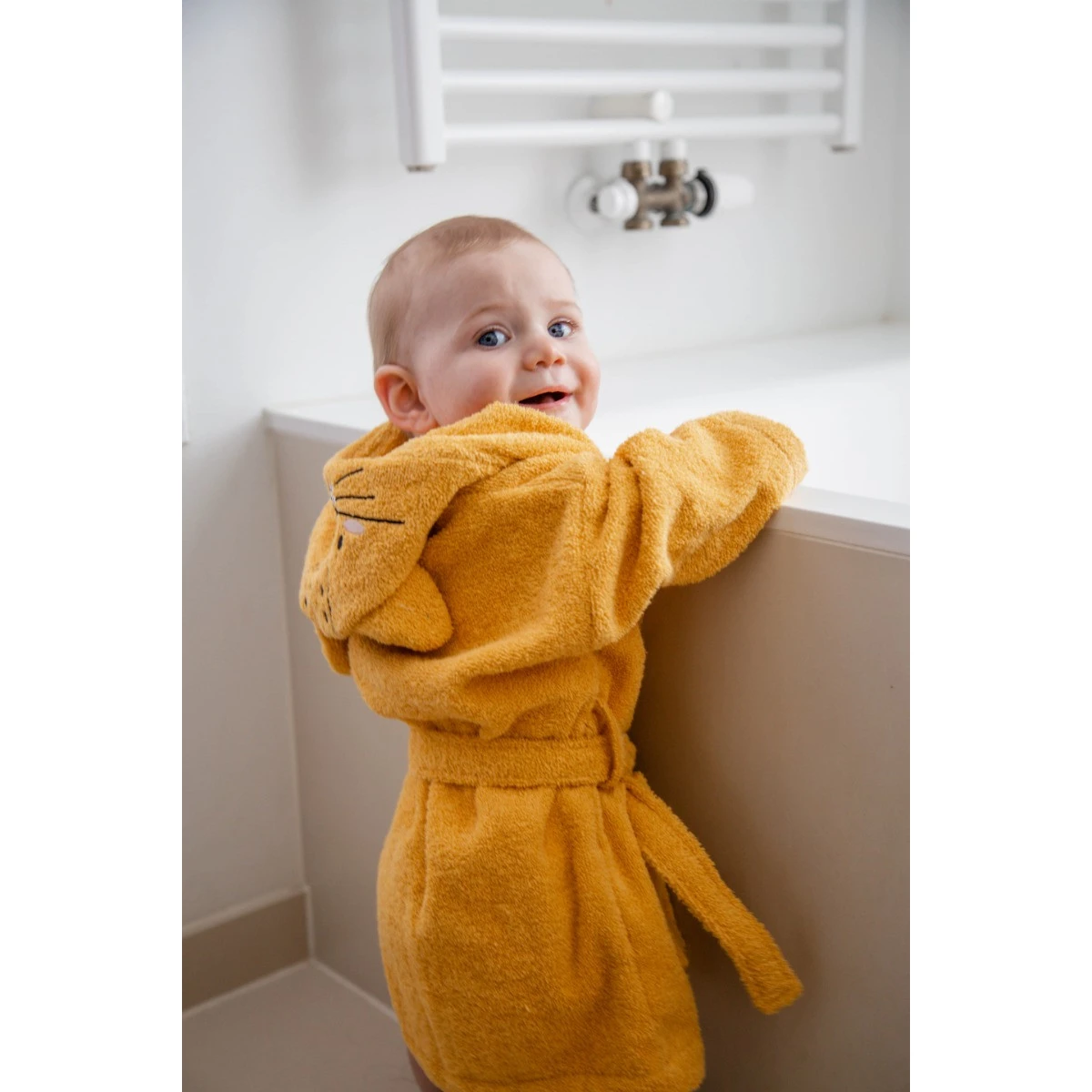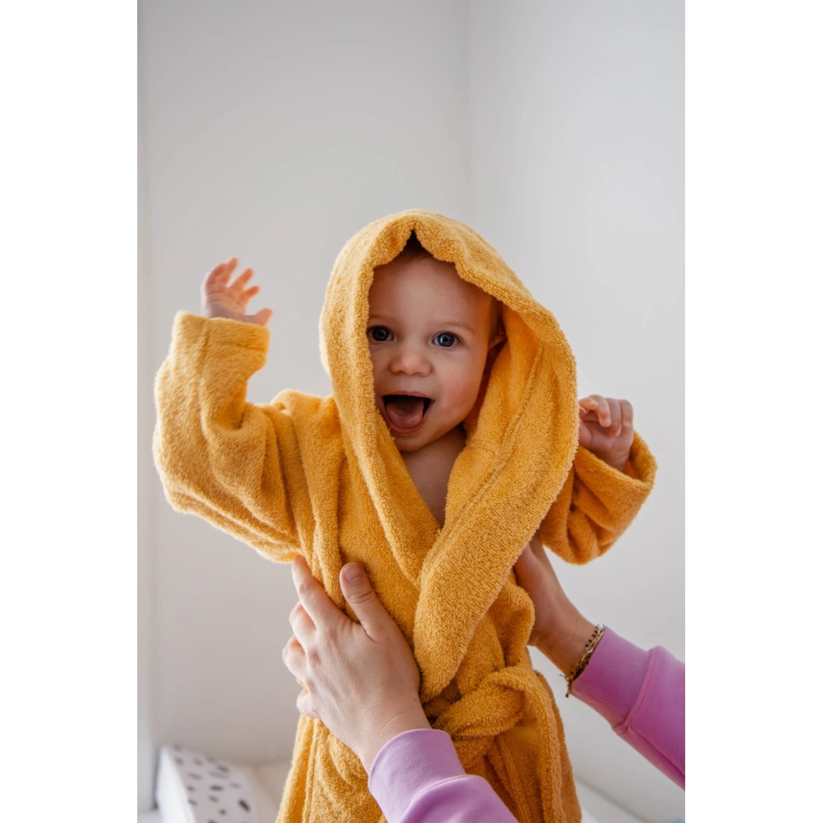 Dit badjasje is geschikt voor kindjes van 0 tot 1 jaar. Is de badjas vies geworden? Hij mag gewassen worden in de wasmachine op 40ºC. Daarnaast is de badjas geschikt voor in de droger en om te strijken.