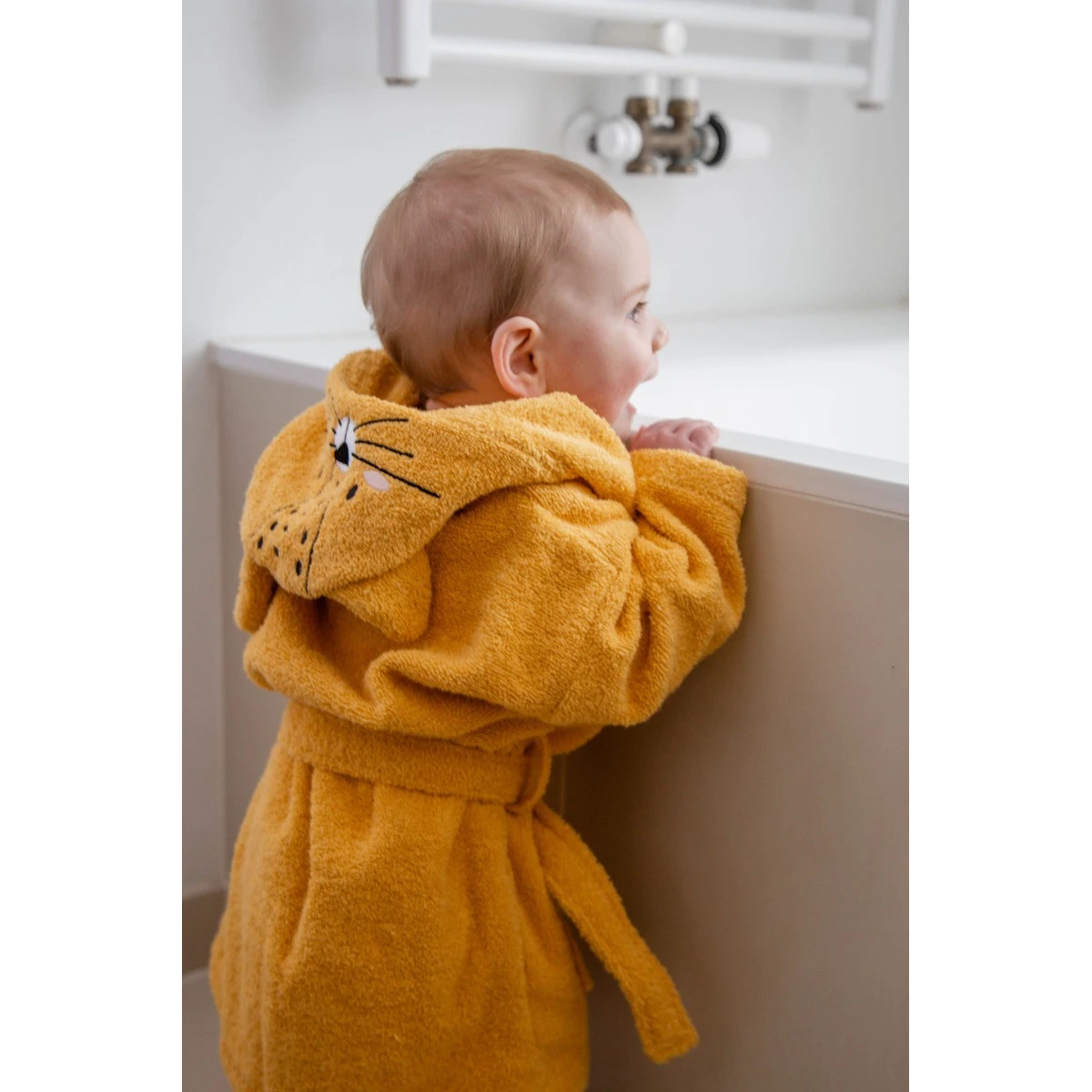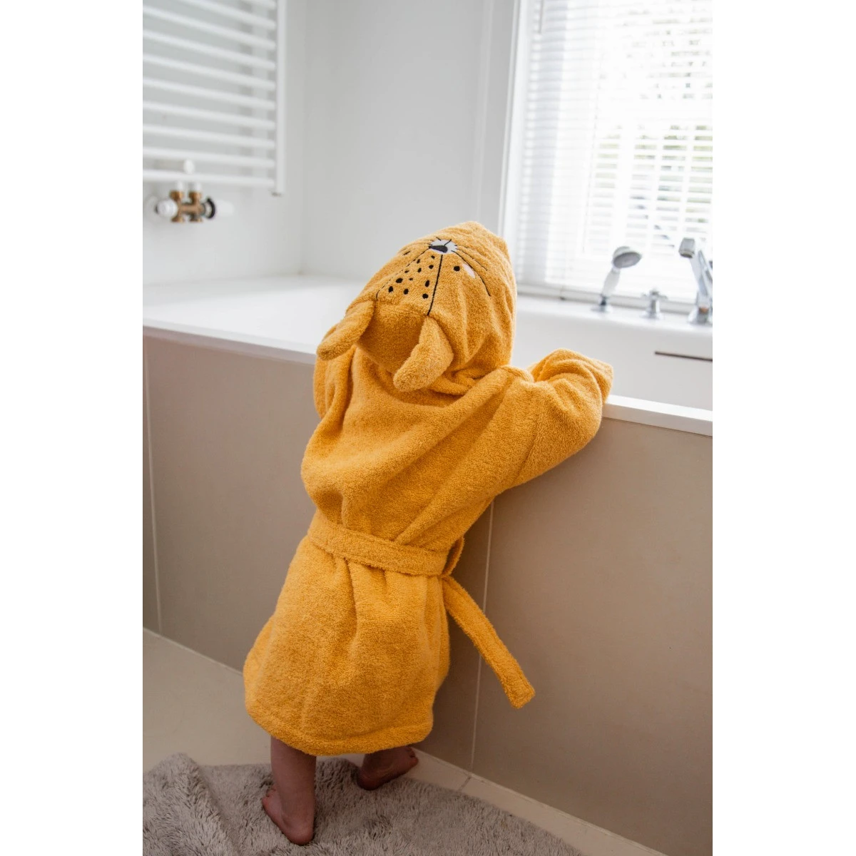 De badjas is extra leuk om aan te trekken want op de capuchon is een print van een luipaardje geborduurd! Zodra je kleine de capuchon op zet, zal hij/zij er dus uitzien als een echt luipaardje. De badjas heeft een riem die je zelf kunt knopen én twee zakjes.