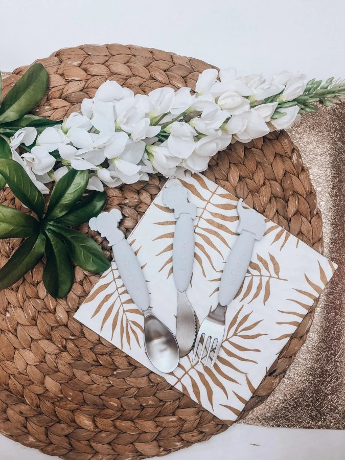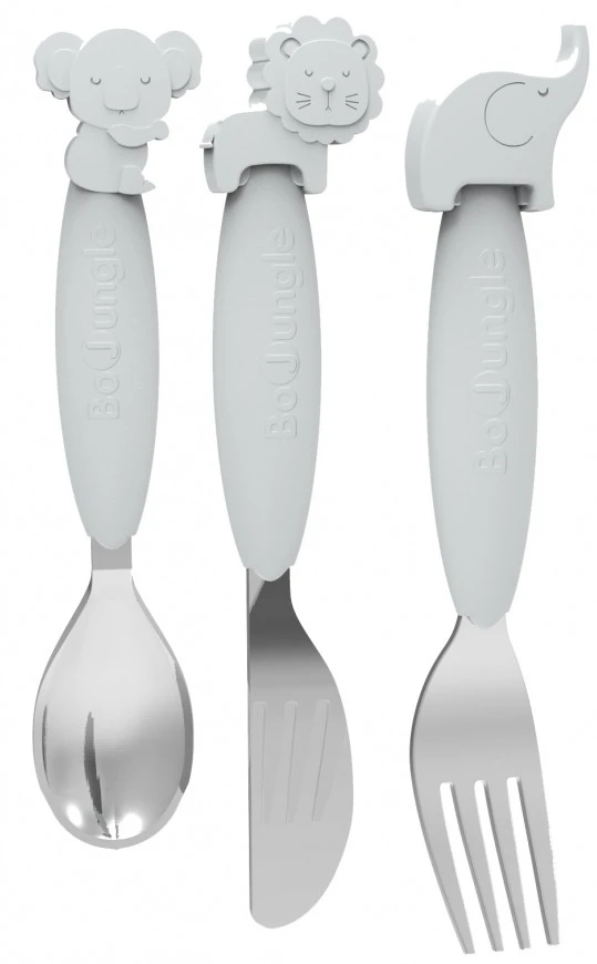 Het bestek heeft een siliconen handgreep in combinatie met roestvrij staal. De schattige dierenfiguurtjes (koala, leeuw en olifant) maakt het zelfstandig leren eten meteen stuk leuker! Smakelijk eten!