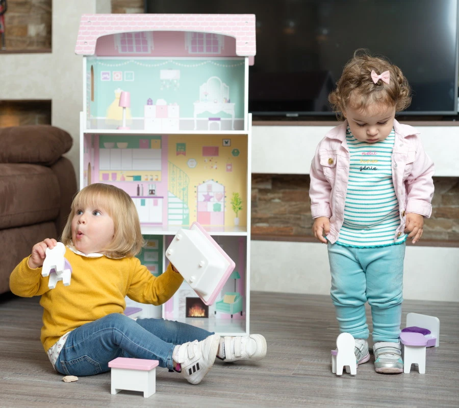 Je kleine zal uren willen spelen met dit houten poppenhuis. Dit poppenhuis ziet eruit als een paleisje, waar de poppen van je kleine zich echte prinsjes en prinsesjes zullen voelen! Hij wordt geleverd inclusief 8 kleurrijke meubeltjes waarmee je kindje het huis mooi én sfeervol kan inrichten, zodat de poppen het aan niets ontbreekt. Je kleine kan de poppen onderstoppen in hun bedje, in bad doen of samen een heerlijke maaltijd bereiden.Â
