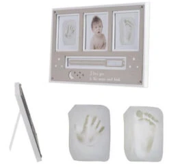 De set bestaat uit 2 klei afdrukken, voor een hand en een voetje. Met de roller zorg je dat het klei een glad oppervlakte wordt, daarna kan je kleine zijn handje/voetje er op leggen. Snij de afdruk uit in het gewenste formaat en de afdruk is klaar om in het fotolijstje te doen. Met de meegeleverde haakjes is het zelfs mogelijk om de lijst aan de muur te hangen.Â