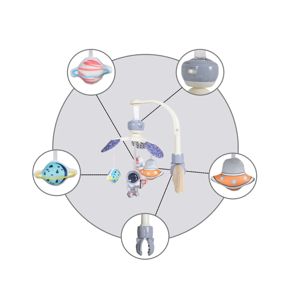 Dankzij een klem bevestig je hem gemakkelijk aan het bedje of de box. Hij is voorzien van een handig paneeltje waarmee je hem kan bedienen. Zo kun je zelf kiezen voor een volgend melodietje, geluidje of om de figuurtjes laten draaien. Hij wordt geleverd exclusief 2x AAA batterijen.