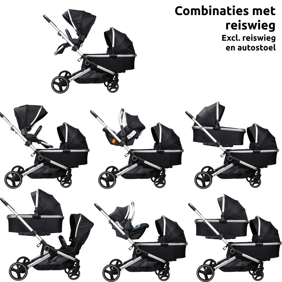 - Eén reiswieg naar binnen en één wandelwagenzitje naar binnen of buiten gericht (reiswieg niet meegeleverd, apart verkrijgbaar)