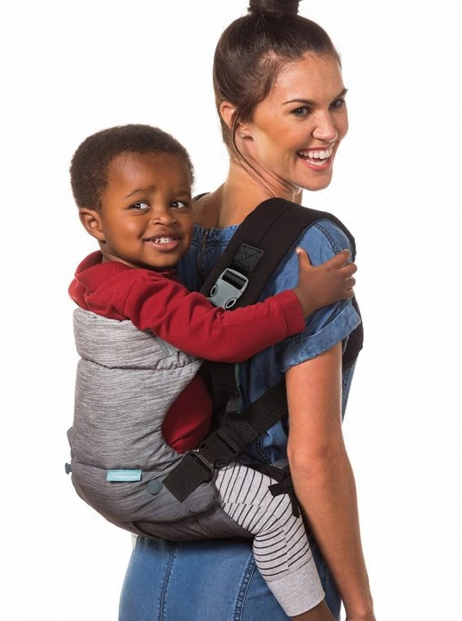 Met de praktische Go Forward Draagzak van Infantino kun je je kindje meedragen op maar liefst 4 verschillende manieren: op de buik (met gezichtje naar voor en achter) en op de rug. Voor kleine kindjes gebruik je het zitje in de smalle versie, later zet je het zitje in de ‘brede stand’. Op die manier is er altijd een prettige en ergonomische positie voor je kleintje en groeit de draagzak met je kindje mee.