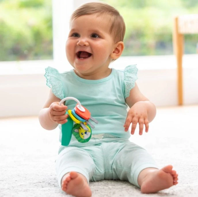 De grote ring maakt het makkelijk om de sleutelbos vast te houden. De sleutels zitten aan elkaar vast en aan de bos zit ook een knisperleeuwtje. De drie batterijtjes zijn vervangbaar zodat het speelplezier kan doorgaan als ze leeg raken, maar het speeltje kan ook uit worden gezet om energie te preserveren. De vrolijke sleutelbos is geschikt voor kindjes vanaf 6 maanden.