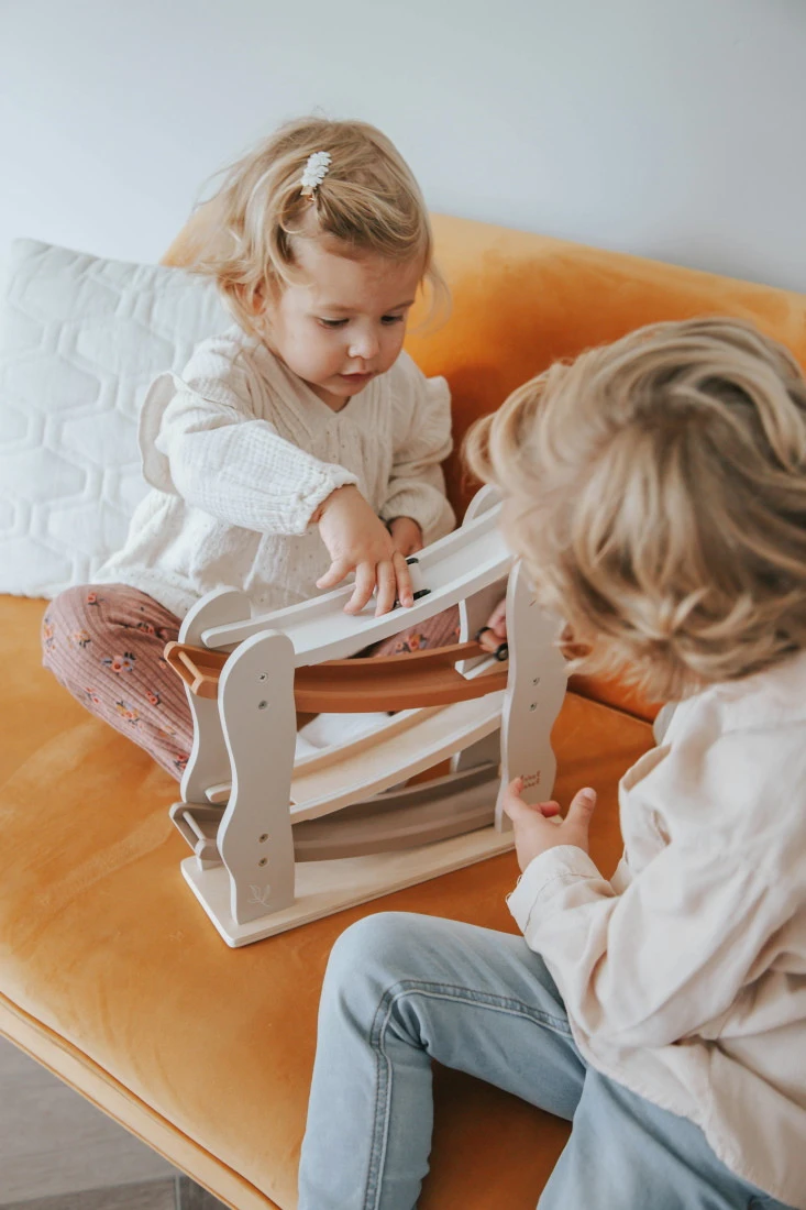 Je kleine zal urenlang speelplezier beleven met deze nougat houten autobaan van Label Label! Zet de autootjes één voor één bovenin de autobaan en laat ze naar beneden racen! Er worden 4 autootjes meegeleverd, zo kan je kleine goed in de gaten houden welke als eerst beneden is.