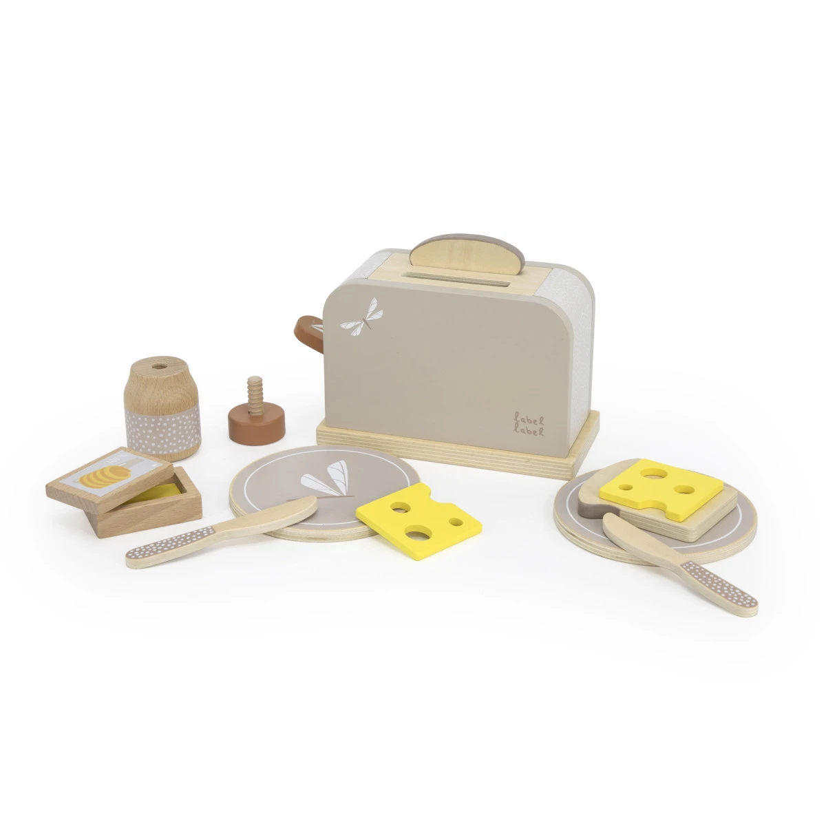 Ping! Je kleine kan heerlijk geroosterd brood maken in deze mooie houten broodrooster van Label Label! Met deze leuke broodrooster set kan je kindje jou ontbijt op bed komen brengen. De set bestaat uit een broodrooster, 2 boterhammen, 2 bordjes, 2 plakjes kaas, een botervlootje, 2 mesjes en een potje jam.Â