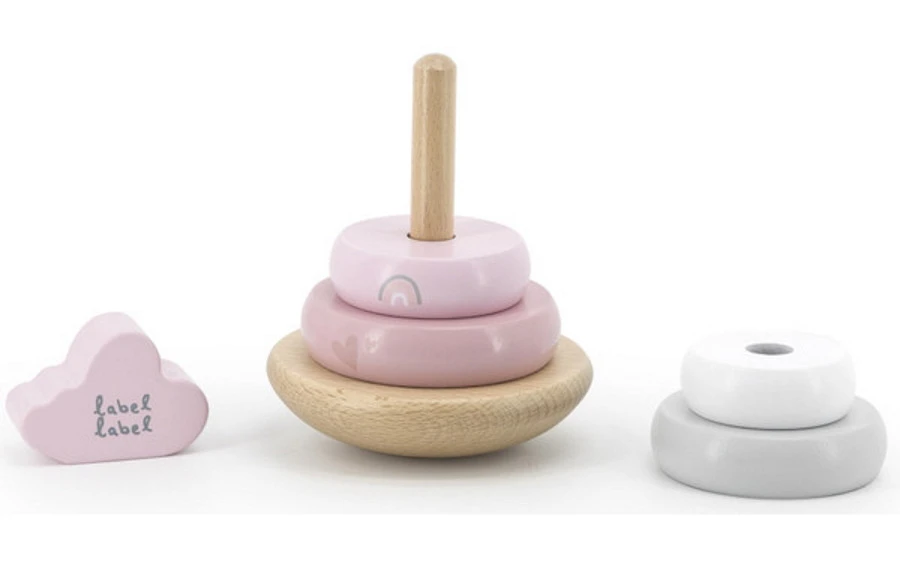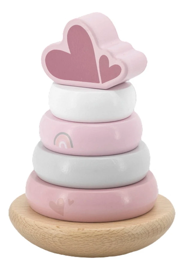 Wat zal jouw kleintje veel speelplezier beleven met deze houten tuimelringpiramide van Label Label! Deze stapelpiramide bestaat uit 6 verschillende onderdelen met zachte pastelkleurtjes. De hartjes bovenop maken het af!