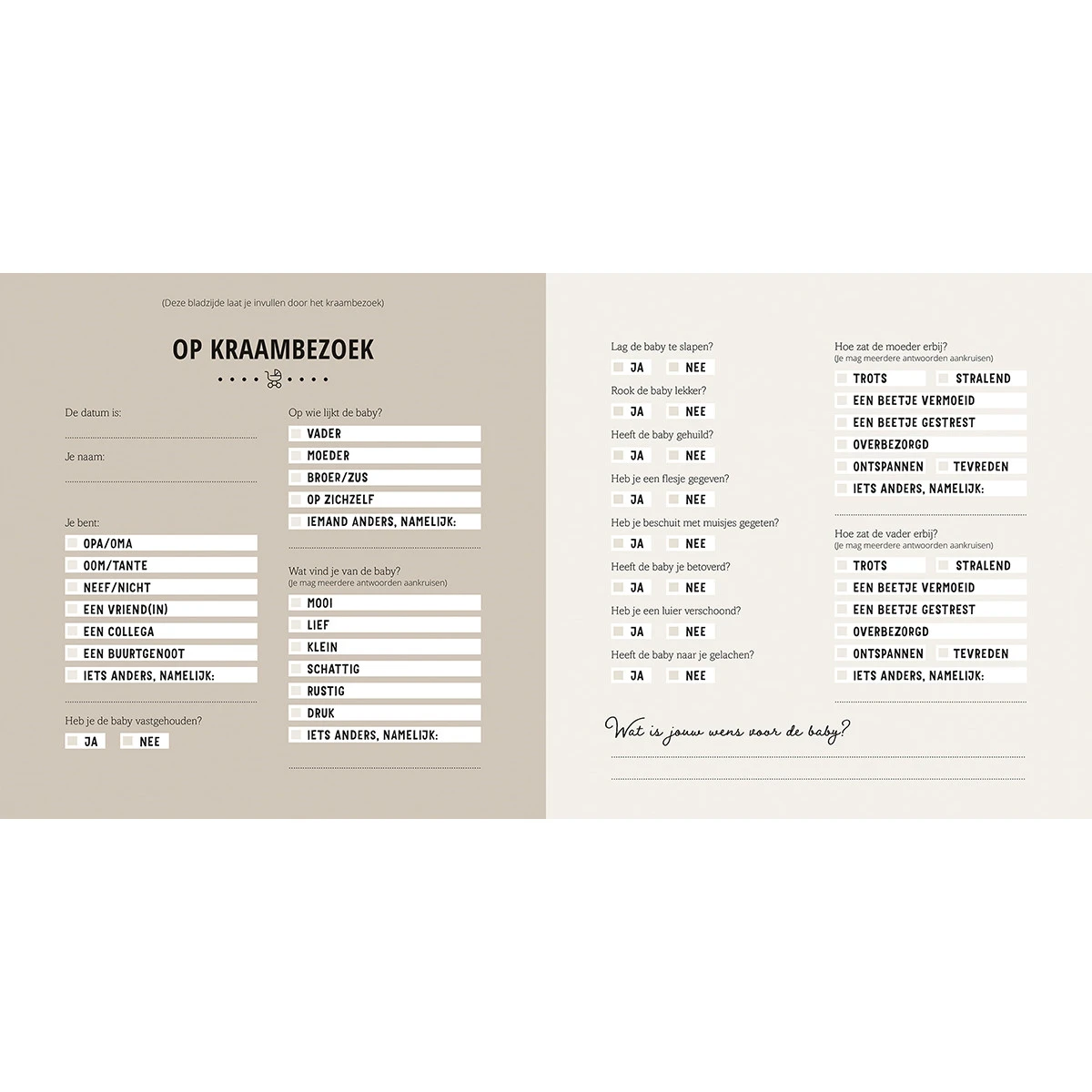 Dit mooie boek is van kwalitatief dik papier. De in totaal 96 pagina’s zijn mooi opgemaakt in pastelkleuren en de kaft is van stevig linnen met mooie gouden letters. Het boek heeft plek voor 15 mensen die op kraambezoek zijn geweest en bevat daarnaast verschillende invulpagina’s voor de ouders over onderwerpen als ‘wie ben ik’, ‘hoe werd ik geboren’ en ‘grote broer/zus’. Uiteraard is er ook volop plek voor dierbare foto’s!Â