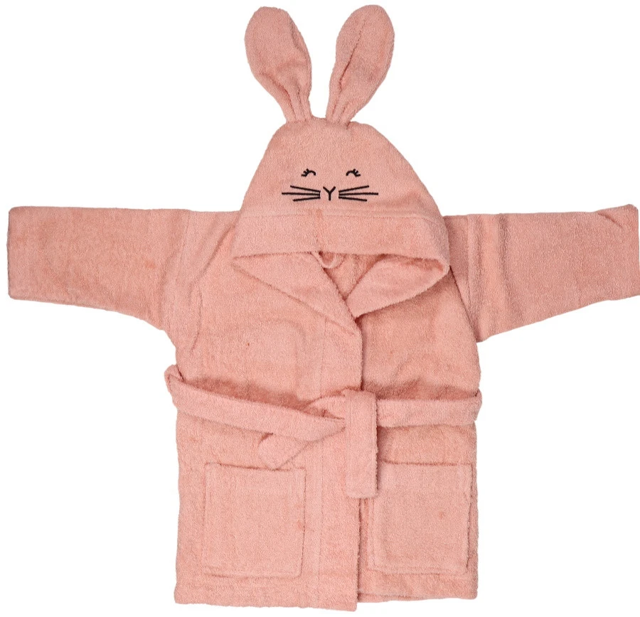 Deze badjas is extra leuk door het design van een konijntje! De capuchon heeft namelijk lange oortjes en het gezichtje van een konijn als printje. Zodra je kleine de capuchon opzet zal hij/zij er dus uitzien als een echt konijn. De riem van het badjas kan je zelf knopen.