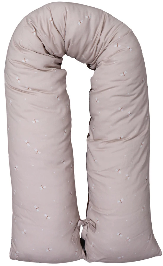 Het voedingskussen heeft een mooie print en een uni-kleurige kant: hierdoor kun je zelf kiezen welke kant je boven legt. Daarbij is hij voorzien van een afritsbare hoes die met de hand gewassen kan worden. Om de ronden vorm te behouden als je kleintje er op zit of tijdens het voeden, zitten er 2 touwtjes aan het einde van het voedingskussen die aan elkaar geknoopt kunnen worden. De lengte van het voedingskussen is 155 cm.