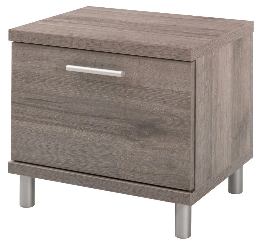 Nachtkastje Naomi is niet alleen praktisch maar staat ook mooi in iedere babykamer! Het nachtkastje is volledig afgewerkt met een grijze houtlook. De zilverkleurige poten zorgen ervoor dat het kastje een stukje van de grond staat. De zilverkleurige, aluminium handgreep zorgt voor een strakke en luxe uitstraling.Â