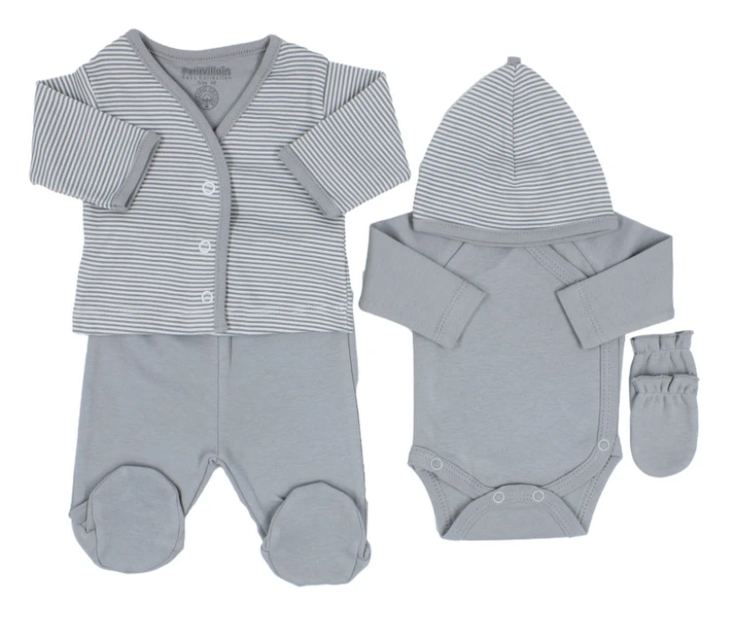 Wat een schattige en praktische babyset van Petit Villain! De Prematuur Grijs 5-delige Babyset bevat een mooi gestreept vestje, een broekje met voetjes, een romper, anti-krabwantjes en een gestreept mutsje. Al deze items zijn speciaal ontworpen voor premature baby’s.