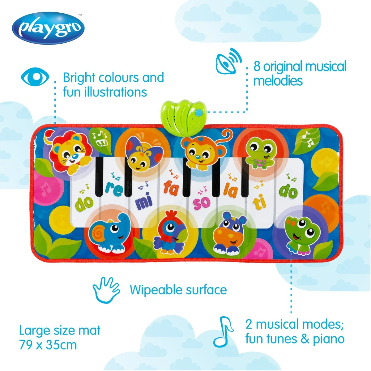De vrolijke jungle vriendjes op de speelmat helpen jouw kleintje mee met het maken van muziek, dit kan je kindje doen door op de speelmat te gaan staan of op de toetsen te drukken. Omdat de mat afveegbaar is, is de speelmat makkelijk schoon te houden.Â