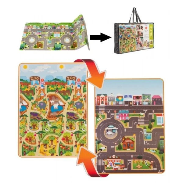 Het speelkleed is gemakkelijk op te vouwen als een accordeon en komt samen met een draagtas. Dankzij de mogelijkheid om het speelkleed op te vouwen als een accordeon, is het mogelijk om het speelkleed aan te passen aan het formaat van de kamer waar je kindje in aan het spelen is.