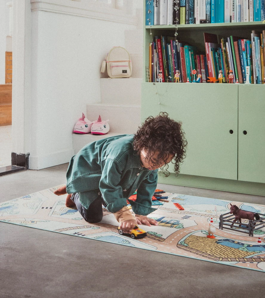 Dit vloerkleed is ideaal voor als je kindje begint met rollen en spelen op de vloer. Is je kleine gek op huisjes, wegen en treinen? Dan is dit vloerkleed helemaal perfect! Het Railroads kleed staat namelijk in het tegen van wegen en treinsporen. De onderzijde van het kleed heeft een anti-slip laag van latex, waardoor het kleed niet wegglijdt op een gladde vloer. Dat is wel zo veilig! Tevens heeft het kleed daardoor een isolerende werking. Hij is onderhoudsvriendelijk en heeft door zijn hoge kwaliteit garen een lange levensduur.