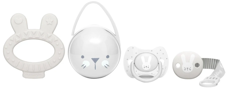 - Set bestaat uit bijtring, fopspeen, speenkoord en speendoosje