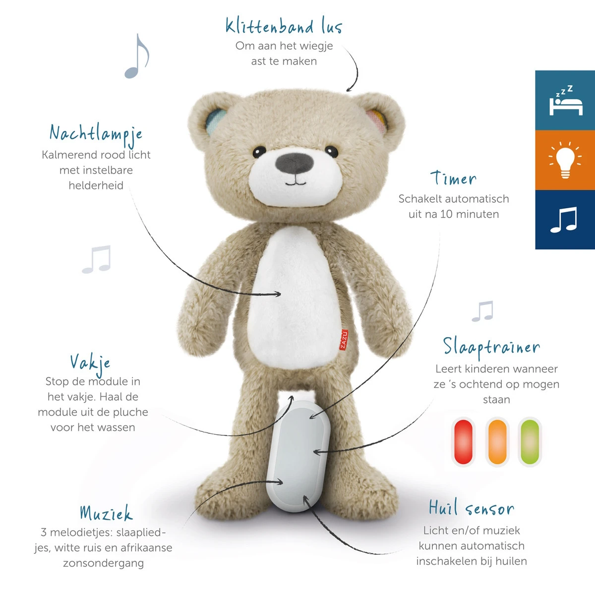 Is het geen schatje, die Brody van Zazu? Deze vrolijke vriend is veel meer dan een normale knuffelbeer. Brody de beer is namelijk een slaaptrainer, nachtlampje en muziekdoosje in één!