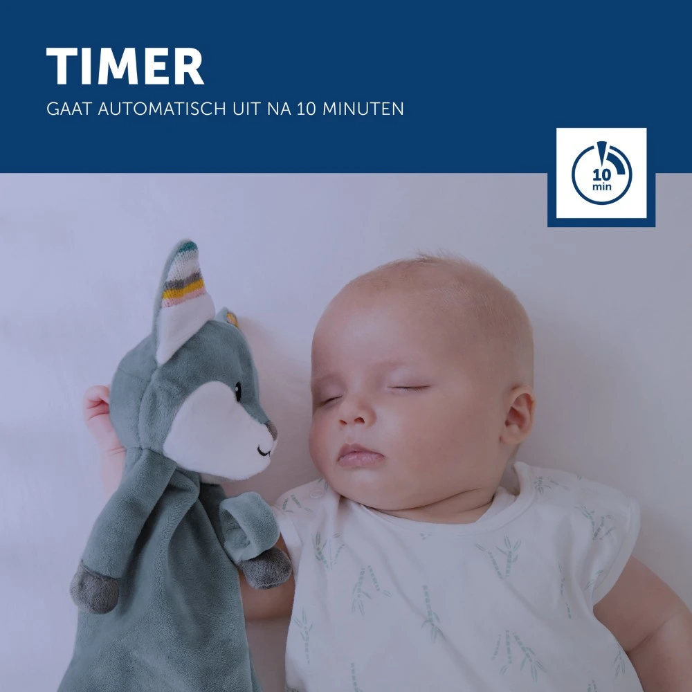 - 6 verschillende geluiden: hartslag, natuurgeluiden, white noise en 3 slaapliedjes