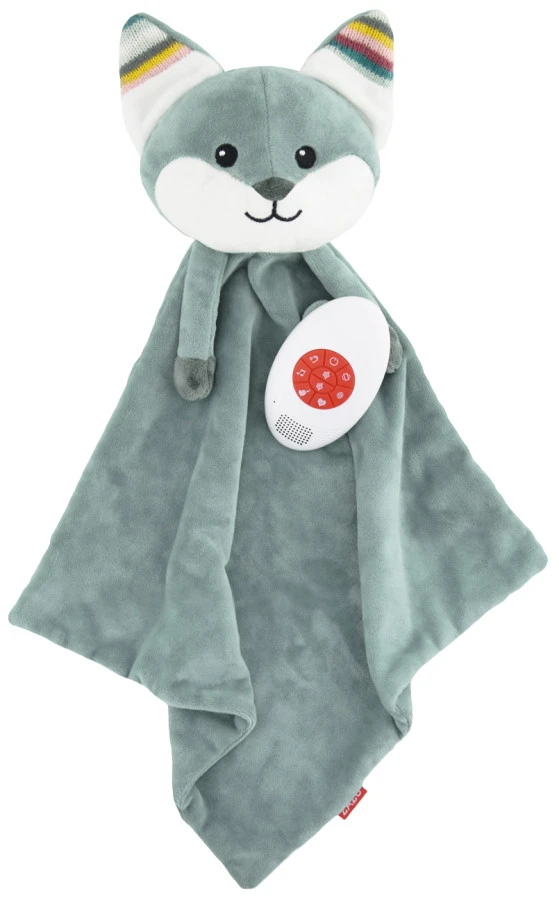 Felix speelt 6 verschillende geluiden af met de keuze uit een hartslag, natuurgeluid, white noise en 3 fijne slaapmelodietjes. Na 10 minuten schakelt de muziek automatisch uit. Als je kleine huilt, zorgt de huilsensor ervoor dat het laatst gekozen nummer weer wordt afgespeeld. Het knuffeldoekje komt met een module waarmee je de geluiden kunt kiezen en het geluidsvolume kunt regelen. De module kun je na het gekozen geluid in het hoofdje van het doekje plaatsen.Â