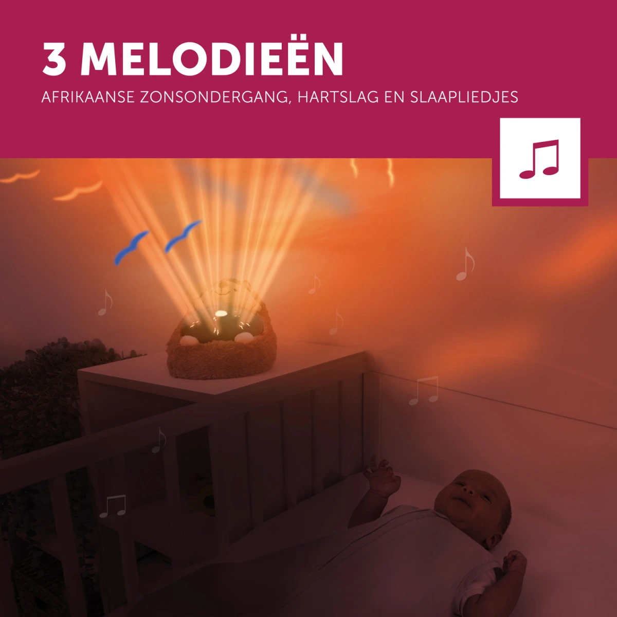 - Keuze uit 3 soorten geluiden: Afrikaanse kalmerende geluiden, hartslag of slaapliedjes