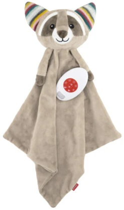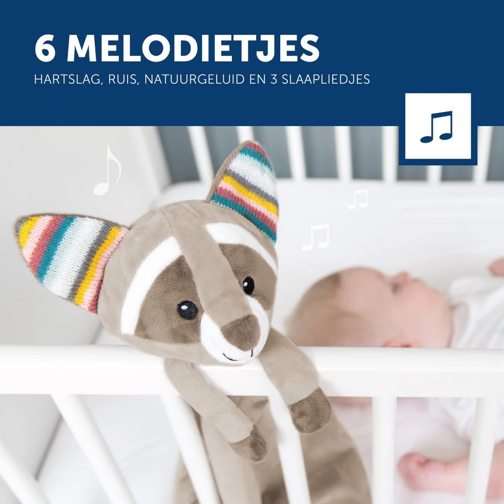 Robin speelt 6 verschillende geluiden af met de keuze uit een hartslag, natuurgeluid, white noise en 3 fijne slaapmelodietjes. Na 10 minuten schakelt de muziek automatisch uit. Als je kleine huilt, zorgt de huilsensor ervoor dat het laatst gekozen nummer weer wordt afgespeeld. Het knuffeldoekje komt met een module waarmee je de geluiden kunt kiezen en het geluidsvolume kunt regelen. De module kun je na het gekozen geluid in het hoofdje van het doekje plaatsen.Â
