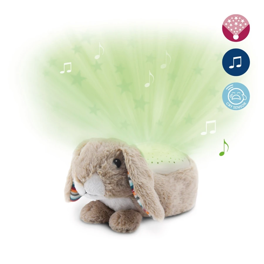Ruby het Konijn van Zazu zorgt ervoor dat je kleintje heerlijk wegdroomt in zijn of haar kamertje. Het schattige konijn projecteert een prachtige sterrenhemel op de muren en het plafond van de slaapkamer. Daarbij kun je kiezen uit 4 kleurstanden: groen, oranje, blauw of afwisselende kleuren.